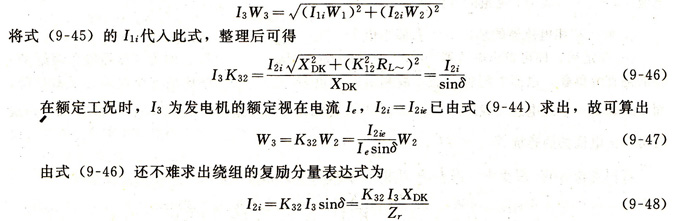將式(9-43)和式(9-48)加以合并,就可得到復(fù)勵變壓器輸出電流的完整表達式。不過要注意,電壓分量I2o已經(jīng)在相位上滯后發(fā)電機電壓δ角(δ≈90°),也即I2o和I2i的相位關(guān)系應(yīng)該和圖9.31(a)所表示的相一致??紤]到這一特點,發(fā)電機的勵磁電流可表示為